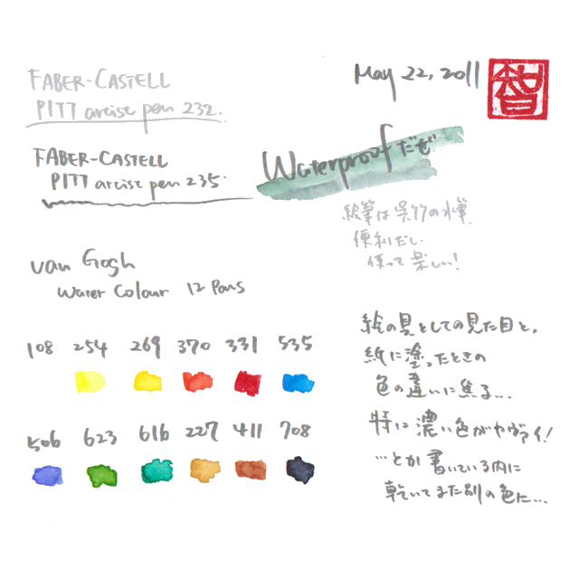 あれこれと考えて、落書きめいたもので良かろう、手軽に色を塗ることができれば楽しかろうと、固形の水彩絵具と水筆(スポイトの先が筆になっているような形状で、バケツに水を汲む必要がない)を手に入れた。耐水性のペンも必要だが、これはデッサン用の鉛筆セットに付属していた筆ペンを使うことにした。