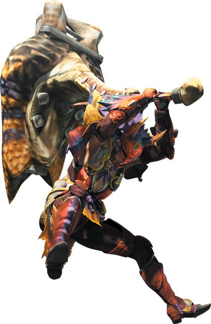 近接武器の中で最大の攻撃力を誇る武器。多彩な溜め攻撃からモンスターの頭を攻撃し、めまいを起こさせる。