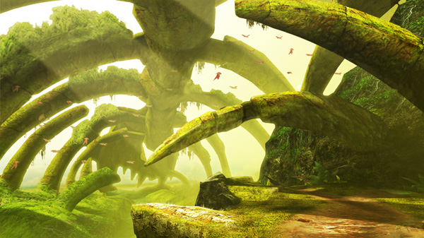 大空の下に広がる命豊かな湿原、生い茂る木々。しかし、ひとたび奥地に足を踏み入れればいつ朽ち果てたともしれない巨大な竜骨を苗床に自然がうっそうと猛威をふるっている。
