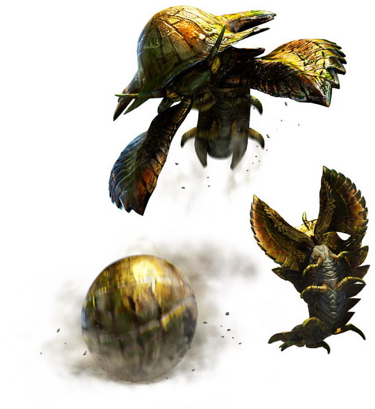 地上や地中に棲息し、モンスターの腐肉や腐葉土を求め広く徘徊する甲虫。 外敵から身を守るために、非常に堅い甲殻に覆われており、近づく者には丸まり転がって突進する。