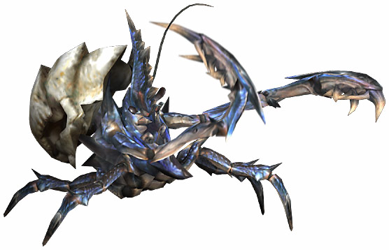巨大なモンスターの頭骨を背負う大型の甲殻種。鋭利で長い鋏を持ち、その刃は堅い火山の岩盤も容易にえぐり、天井を移動する事も可能にするという。稀に貴重な真珠を殻内に生成し、珍重されている。