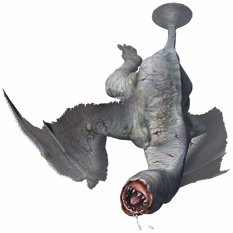 洞窟に生息する不気味な飛竜。暗い所にいることが多いため目は退化しており、その分嗅覚が発達している。体内に発電器官を持っており、体から発する電気で獲物を麻痺させる。