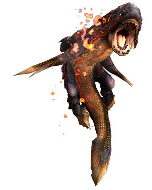 マグマの中を棲み処とする魚竜。鱗の表面には冷え固まった溶岩が幾層にも重なり、強固な鎧の役割を果たしている。灼熱のマグマの中を泳ぎ回り、飲み込んだ溶岩を吐きつけて獲物を襲う…その特異な生態は、学者達の研究対象となっている。