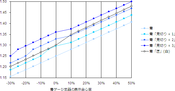 斬れ味による基本威力の補正、会心率の上乗せ補正を考慮して、青ゲージ武器のダメージ量を求めたのが下のグラフである。縦軸が物理ダメージ量の期待値、横軸が武器の表示会心率(スキル発動前に、武器屋や自室のステータス画面に表示される数字)である。