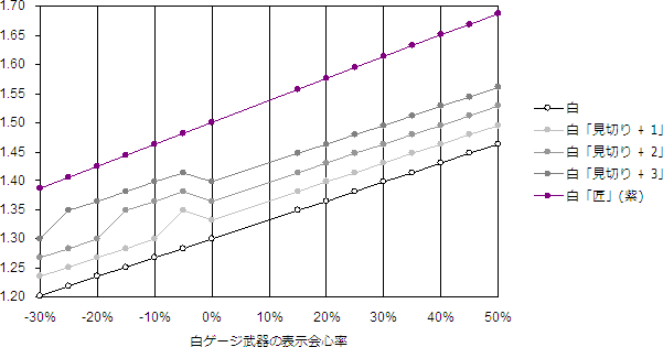 白ゲージ武器について、「匠」と「見切り」の効果を検証したのが下のグラフである。青ゲージ武器と同様の理由で、表示会心率が 5% および 10% の白ゲージ武器は存在しない。