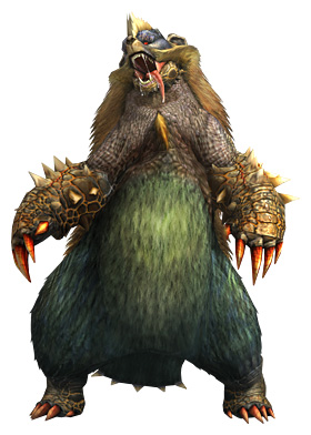 温暖湿潤な地域の山や森に生息する牙獣。二足で起ち上がり、大好物のハチミツを採取したり、河原で魚を捕る事で知られる。鋭い爪と厚い甲殻を持つ前脚は非常に発達しており、その一撃は脅威。美しい青毛を持つ事から“青熊獣”とも呼ばれる。