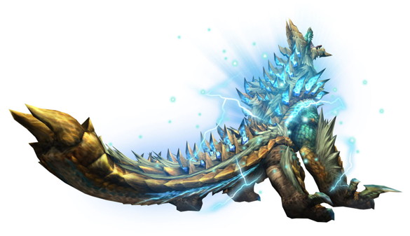雷光を帯びたその姿から“雷狼竜”とも呼ばれる牙竜種。起伏の激しい山林に棲むため、かぎ爪は鋭く、四肢は強靭に発達している。狩りの際には無数の雷光虫を集める事で、まとう電力を飛躍的に高めているとされ、超帯電状態と呼ばれる姿に変化する。