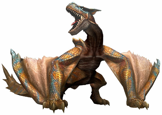 原始的な風貌を残す飛竜。性格はいたって凶暴で、発達した四肢を使っての突進、強力な爪と顎の一撃、どれも恐ろしい威力で注意が必要。獲物を求めて広い範囲を移動し、凍土にまで姿を現すという。強烈な咆哮を放つため、“轟竜”の異名をもつ。