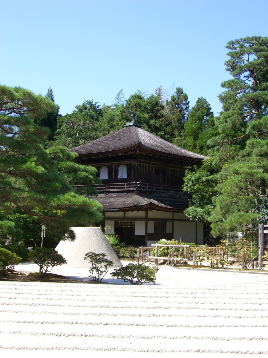 慈照寺銀閣(国宝)。銀閣寺というのは俗称で、本来は観音殿である。手前の白砂の庭は銀沙灘(ぎんしゃだん)、その向こうにある円錘台が向月台(こうげつだい)。銀沙灘の破門は海、向月台の形は富士山をイメージしたものだという。
