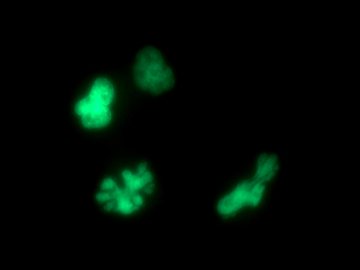 核移行シグナルを持つ DNA 結合タンパク質と GFP を融合させ、細胞内で発現させた。融合タンパク質も DNA と結合するようで、分裂中の細胞では染色体がはっきりと見える。