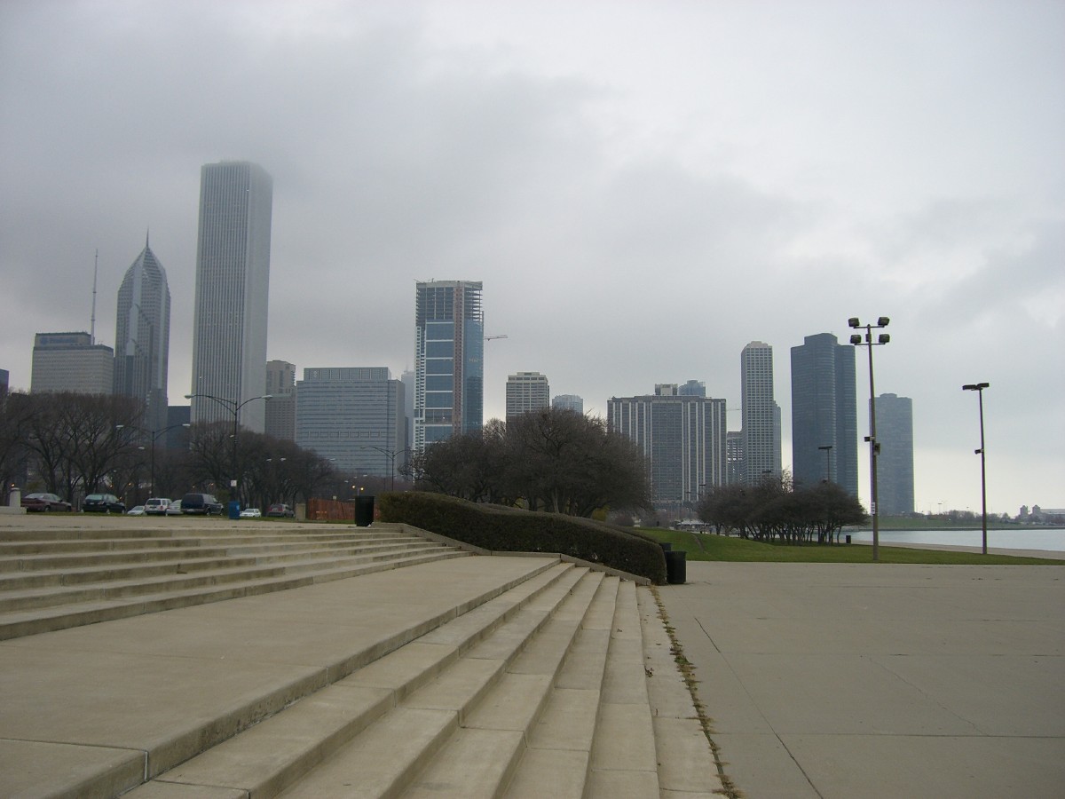 シカゴの摩天楼。湖水から立ちこめる霧で空が重く低い。