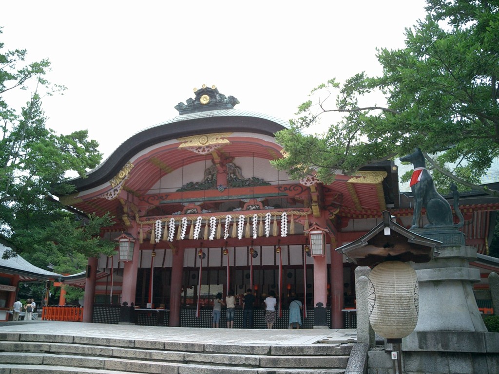 伏見稲荷大社本殿。御利益は、商売繁昌、家内安全、交通安全、厄除、開運招福、入試合格、学業成就、大漁満足、海上安全、良縁、心願成就、初宮、旅行安全、安産、子授、病気平癒、七五三詣などなど。素晴らしい。