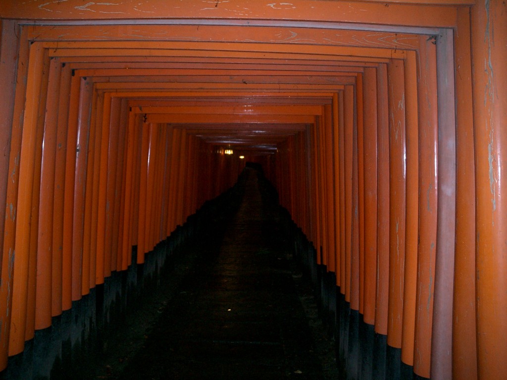 伏見稲荷大社千本鳥居。道を行くほどに、鬼のように鳥居が増える。しかも暗い。参道ではなく、もはや冥府魔道。