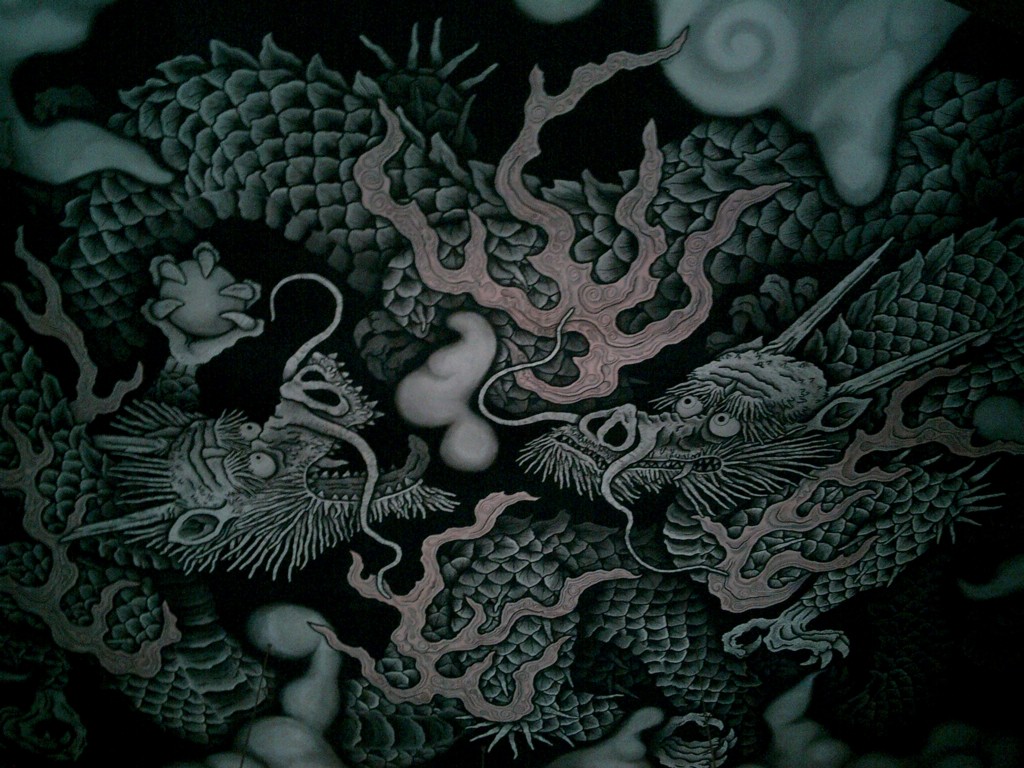 建仁寺法堂の天井画「双龍図」。小泉淳筆。建仁寺創建八百年を記念して描かれた。写真ではその巨大さが伝わりにくいかもしれないが、百畳の天井いっぱいに描かれた双龍はまさに圧巻。