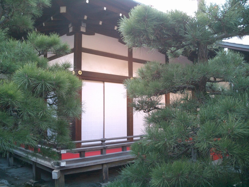 下鴨神社葵生殿(重要文化財)。預屋ともいう。結婚式場でもある。緑松がめでたい感じ。
