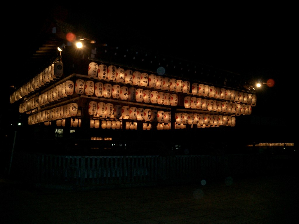 夜の八坂神社境内。祇園の店々の提灯が静かに灯っている。